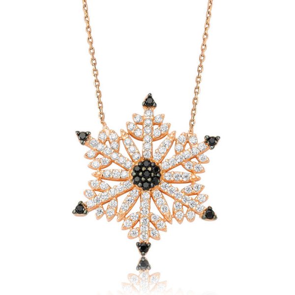 Kadınların ışıltısı, berraklığı kar tanesine benzetilip özel olarak tasarlanmıştır. Kar tanelerinin her birinin bayanlar gibi eşsiz ve ayrı kıymette olması onları özel kılan bir diğer özelliktir. Asilliği her dönemde dikkat çekmeyi başarmıştır. Bunun yanında insanların tıpkı kar taneleri gibi birbirlerine zarar vermeden de mutlu bir şekilde yaşayabileceklerini sembolize etmektedir. Bu şık kolye; doğum günü hediyesi, sevgililer günü hediyesi veya annelere hediye olarak özel günlerde tercih edilebilecek mükemmel bir seçenektir. Kolye, 925 ayar gümüşten imal edilmiştir. Gümüş üzerine rose kaplama yapılmıştır. Rose altın kaplama yapılan gümüş bayan kolye modelleri parlaklığını uzun süre muhafaza eder, gümüşü pembe renge dönüştürür ve oksitlenmesi gecikir. Zincir boyu ortalama 45 cm’dir. Tüm gümüş bayan kolye modellerinde olduğu gibi bu gümüş kar tanesi bayan kolye de tamamı el emeği ile üretilmiştir. Gümüş ve değerli taşlar nedeniyle belirtilen ortalama ürün ağırlığında ± %10 sapma olabilmektedir.