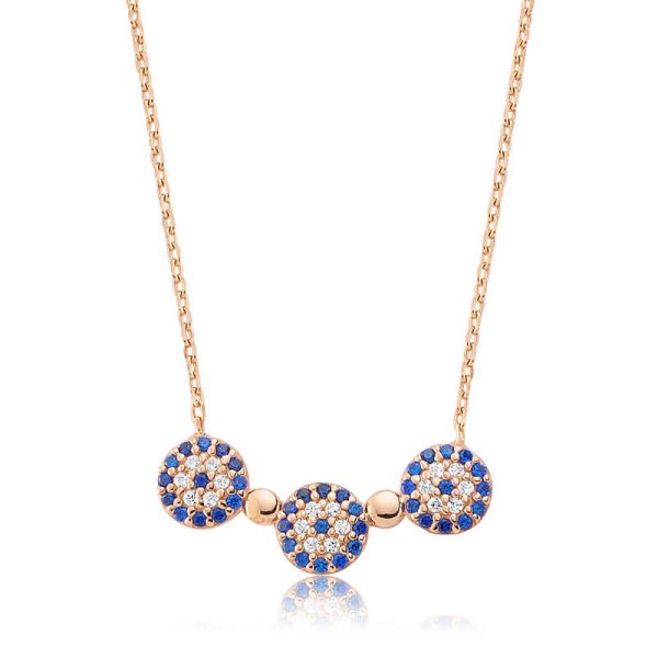 Genelde nazar boncukları göz şeklinde olur. Göze aynı zamanda boncuk da denmektedir. Bu bağlamda bakıldığında kişinin dünyaya açılan penceresi gözdür ve göz her türlü, iyi ve kötü düşüncelerin ilk çıkış noktası olarak kabul edilir. Bu yüzden bakışlardan, kötü gözlerden korunmak amacıyla emici özelliği olduğuna inanılan mavi renkli taşlar eskiden beri kullanılagelmiştir. Sizin olduğu kadar sevdiklerinizin de keyifle takacağı gümüş nazarlı kolye sevdiğinize verebileceğiniz en güzel hediyelerden biri olacaktır. Bu gümüş nazarlı kolye modeli 925 ayar gümüşten imal edilmiştir. Gümüş üzerine rose altın kaplama yapılmıştır. Rose altın kaplama yapılan gümüş kolye modelleri parlaklığını uzun süre muhafaza eder ve oksitlenmesi gecikir. Kolye üzerinde bulunan taşlar zirkondur. Gümüş olan zincir uzunluğu ortalama 45 cm’dir. Tüm gümüş kolye modellerinde olduğu gibi bu gümüş nazarlı kolye modeli de el emeği ile üretilmiştir. Gümüş ve değerli taşlar nedeniyle belirtilen ürün ağırlığında ± %10 sapma olabilmektedir.