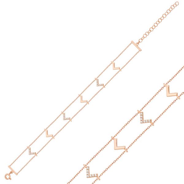Şık ve fantezi görünümü seven kadınlar için ideal bir seçenek. Koleksiyonlarda; gösteriş ve şıklığın peşinde olan kadınlar için taşlı ve taşsız v sembollerden oluşan çift zincirli bileklik her zevke ve konsepte uygun modeli ile sizleri bekliyor. Bu şık bileklik modeli 925 ayar gümüşten imal edilmiştir. Gümüş üzerine rose altın kaplama yapılmıştır. Rose altın kaplama yapılan gümüş bileklik modelleri parlaklığını uzun süre muhafaza eder, gümüş rengini pembe renge dönüştürür ve oksitlenmeyi geciktirir. Üzerinde bulunan taşlar zirkondur. Gümüş bayan bileklik modellerinin tamamında olduğu gibi gümüş v bayan bileklik modeli de el emeği ile üretilmiştir. Gümüş ve değerli taşlar nedeniyle belirtilen ortalama ürün ağırlığında ± %10 sapma olabilmektedir.