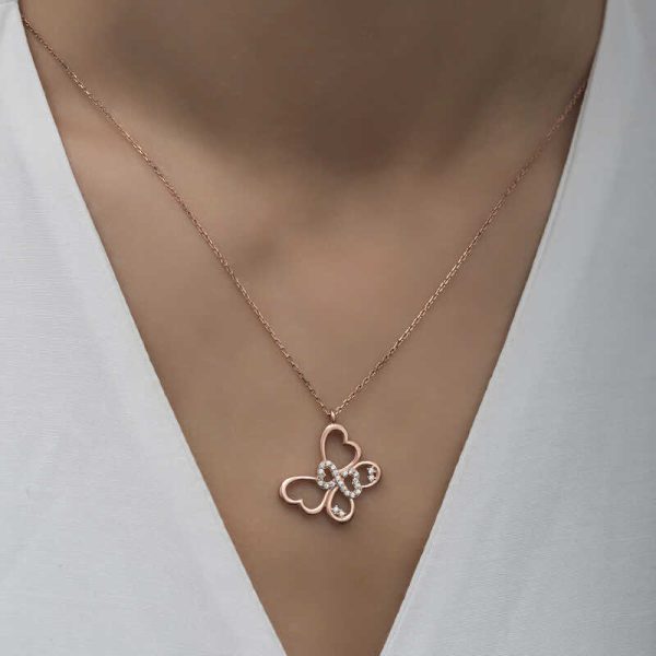 Kelebek kolye tertemiz sevginin ve aşkın ifadesidir. Sonsuz sevginizi sevdiğinize gösterebileceğiniz bir kolye modelidir. Sevdiklerinize alabileceğiniz anlamlı bir hediye bu şık kelebek kadın kolye 925 ayar gümüşten imal edilmiştir. Gümüş üzerine rose kaplama yapılmıştır. Rose kaplama yapılan gümüş kadın kolye modelleri parlaklığını uzun süre muhafaza eder ve oksitlenmesi gecikir. Kolye üzerinde bulunan beyaz taşlar zirkondur. Gümüş olan zincir boyu ortalama 45 cm’dir. Gümüş sonsuzluk kelebek kadın kolye modeli diğer tüm gümüş kadın kolye modellerinde olduğu gibi el emeği ile üretilmiştir. Gümüş ve değerli taşlar nedeniyle belirtilen ortalama ürün ağırlığında ± %10 sapma olabilmektedir.