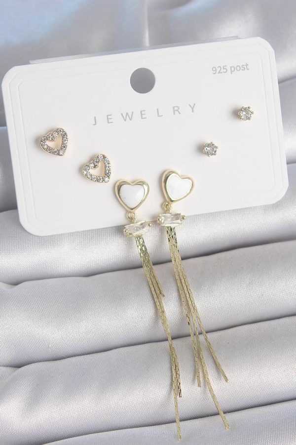 Pirinç Gold Renk Beyaz Mineli Sallantı Mineli Kalp Model Zirkon Taş Detaylı 925 Ayar Gümüş Çivi Kadın Küpe Seti – BKP10494 (538538)