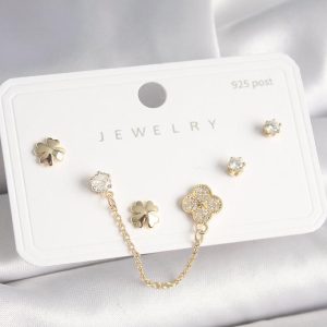 925 Ayar Gümüş Çivi Pirinç Gold Renk Zirkon Taşlı Yonca Model Sallantı Zincir Detay Kadın Küpe Seti - BKP10401 (538538)